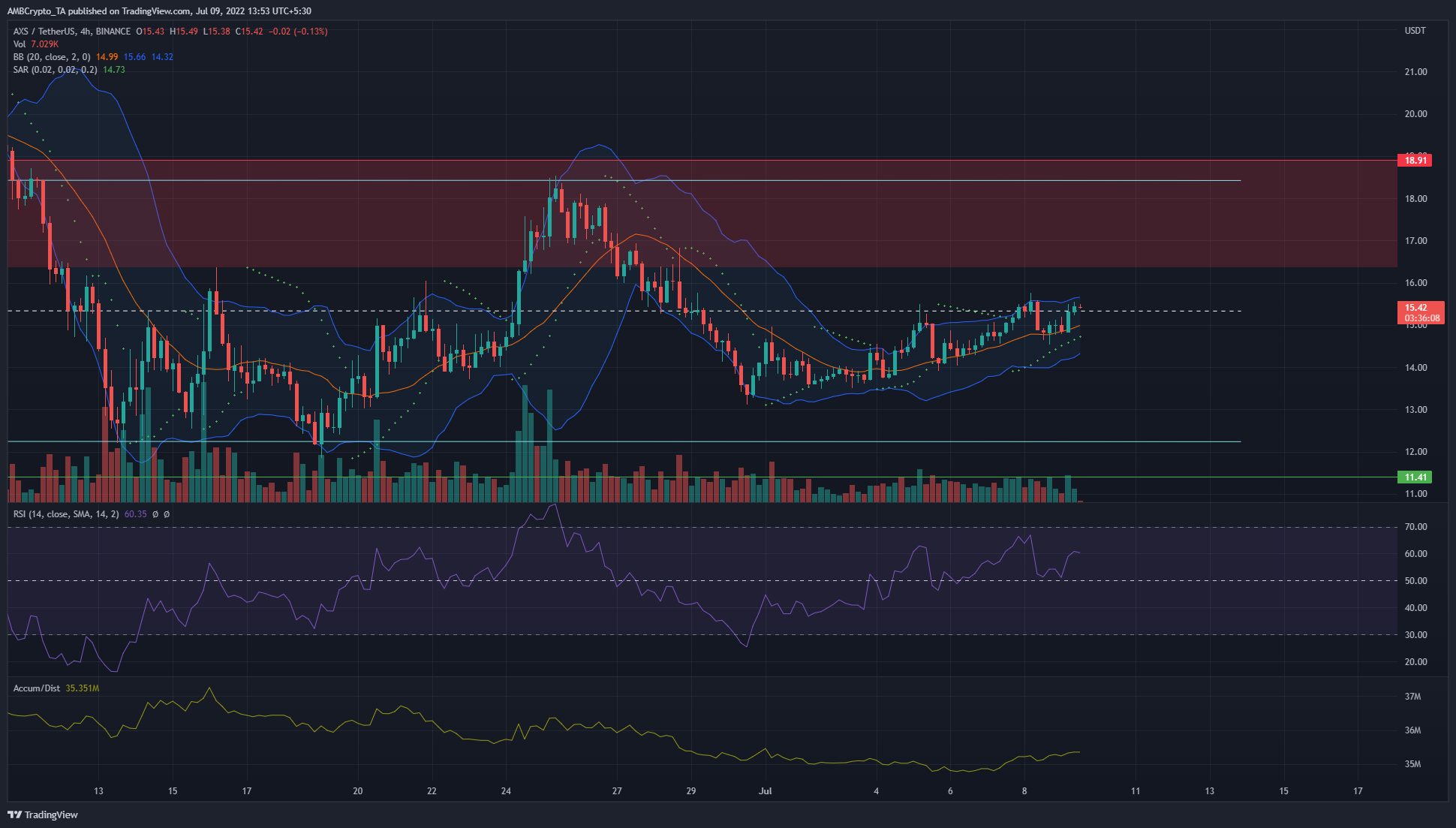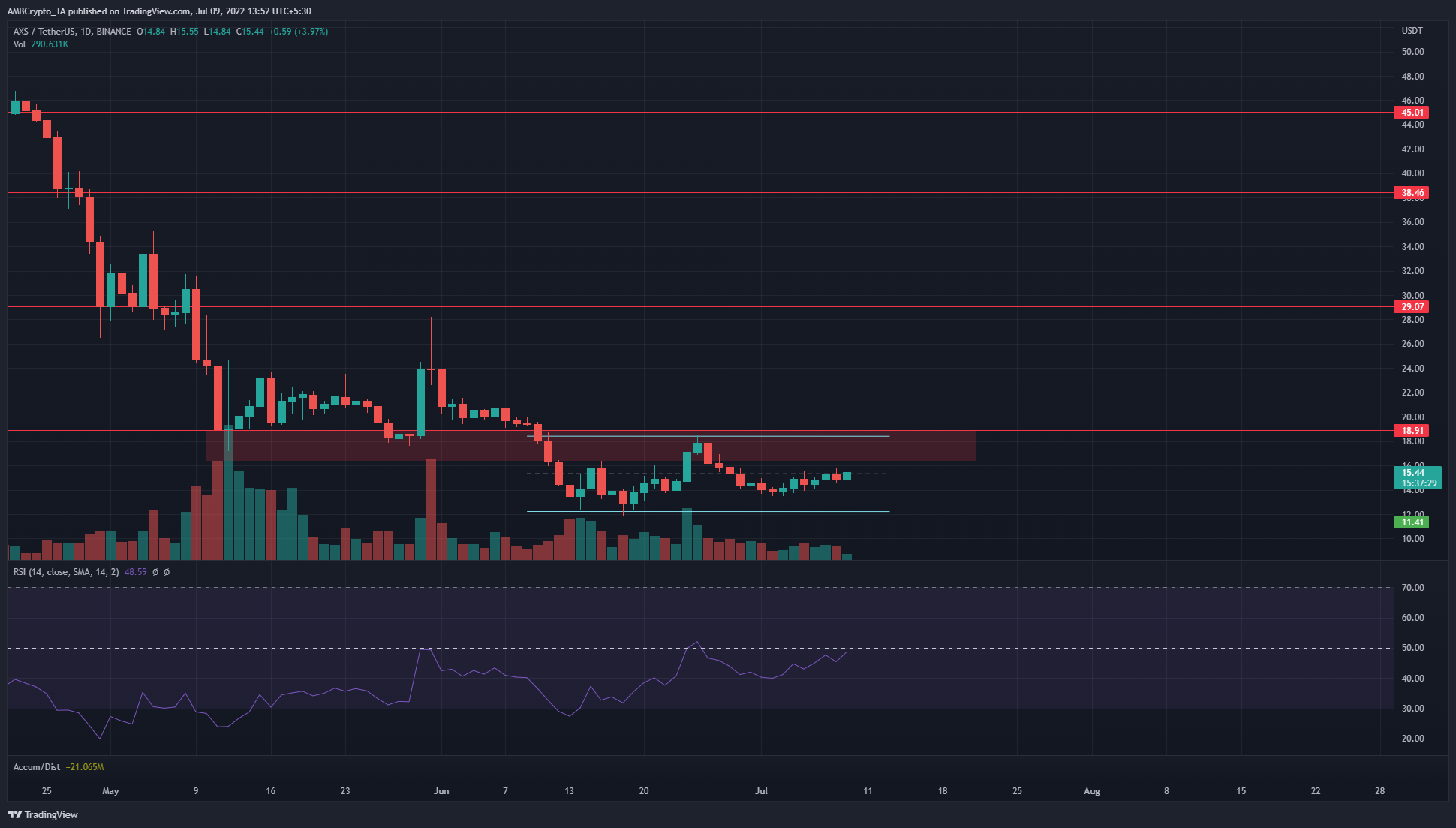 Trên biểu đồ khung thời gian cao hơn, Axie Infinity [AXS] đã hình thành một phạm vi kể từ giữa tháng Sáu. Một điểm khác cần lưu ý là phạm vi này nằm ngay bên dưới vùng kháng cự cứng ở mức 18 đô la. Bitcoin [BTC] cũng phải đối mặt với mức kháng cự trong vùng $ 23k. Đối với AXS, có thể có một động thái đi lên. Tuy nhiên, xu hướng dài hạn vẫn là giảm và việc giao dịch đi ngang trong tháng qua có thể không có nghĩa là xu hướng giảm giá đã kết thúc.