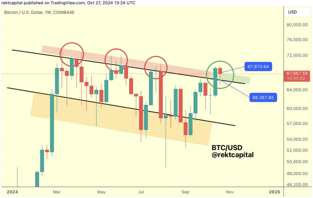 Trong một phân tích ngày 27 tháng 10 trên X, Rekt Capital cho biết Bitcoin gần đạt đến việc kết thúc tuần ở mức trên 67.900 USD.