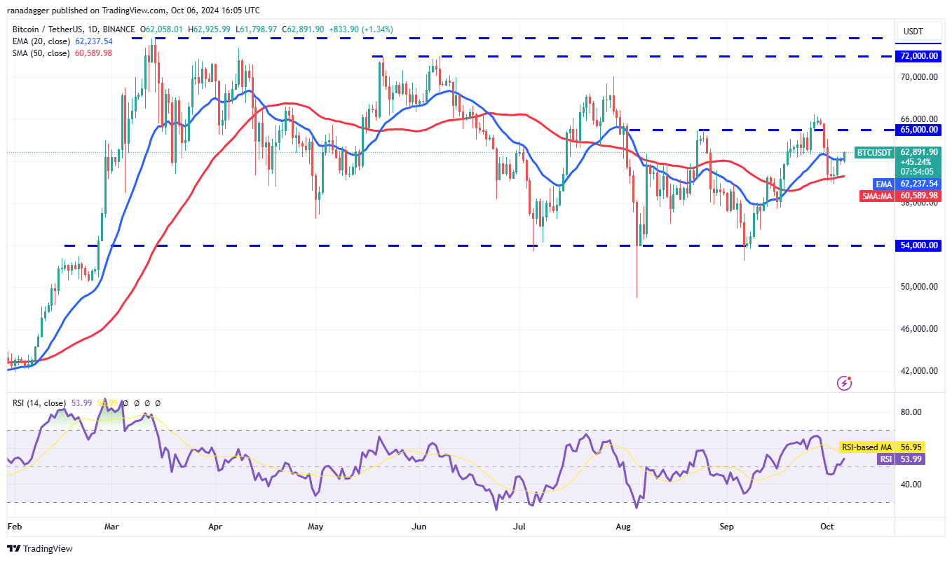 Bitcoin bật lên từ đường trung bình động đơn giản 50 ngày (60.589 USD) vào ngày 4 tháng 10, cho thấy rằng các nhà đầu cơ giá lên đang cố gắng hình thành một đáy cao hơn.