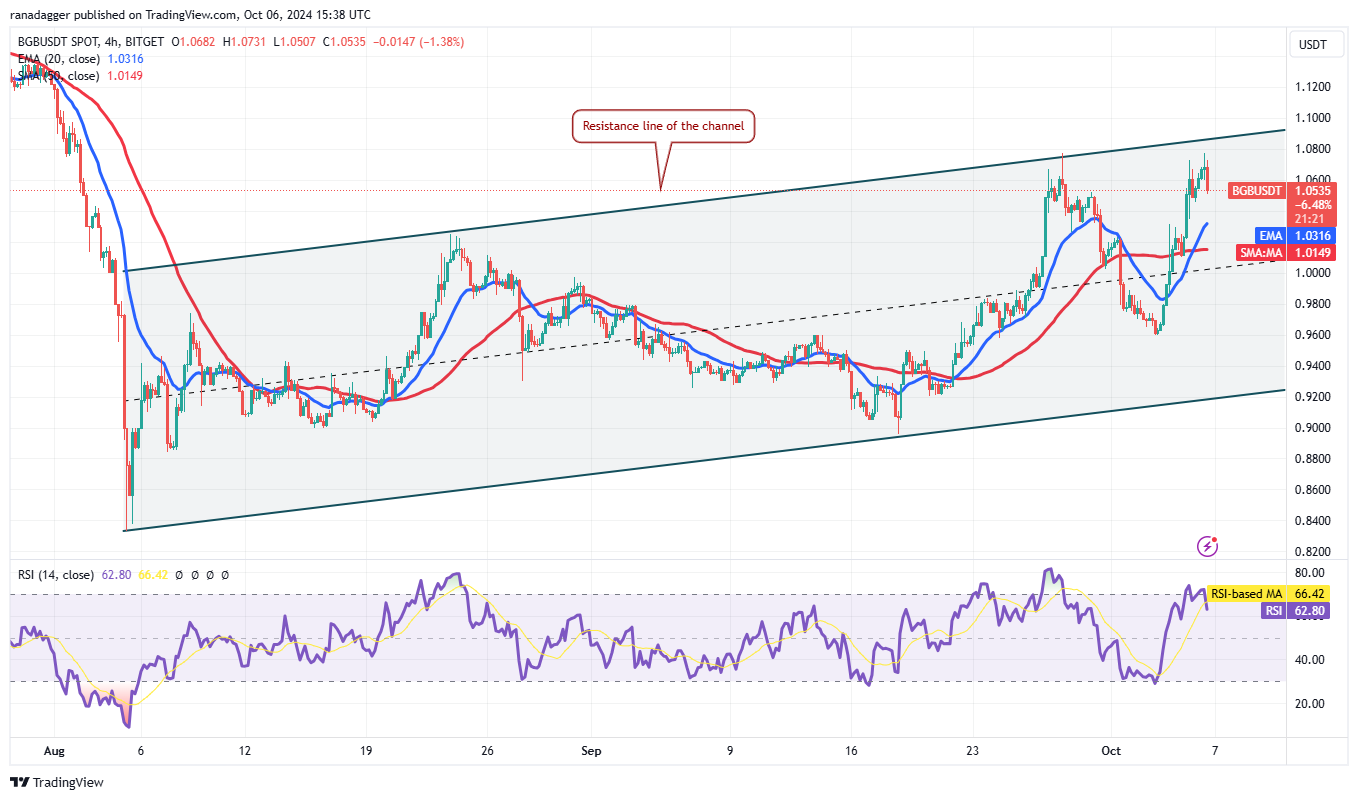 Đường EMA 20 ngày (0,99 USD) đã bắt đầu dốc lên, và RSI đang ở vùng tích cực, cho thấy rằng các nhà đầu cơ giá lên đang có ưu thế. Nếu người mua đẩy giá vượt qua 1,08 USD, cặp BGB/USDT có thể tăng lên 1,14 USD và sau đó là 1,22 USD.