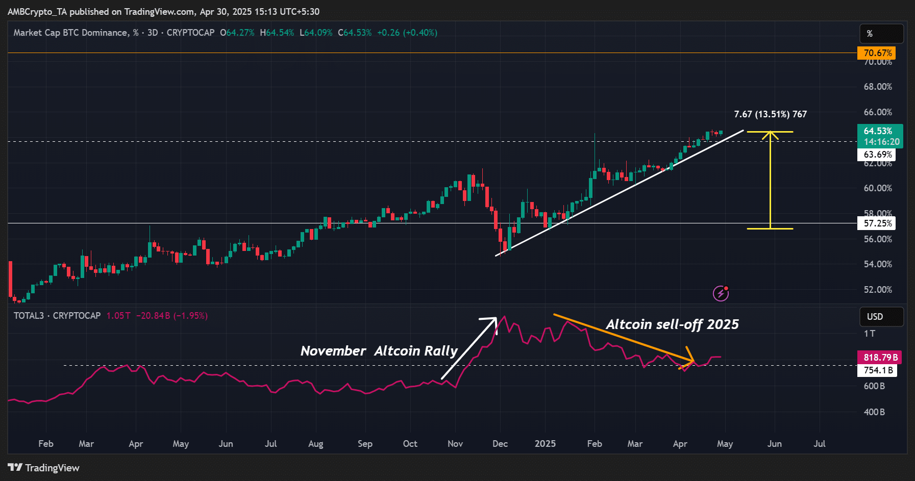 Độ thống trị Bitcoin [BTC] (BTC.D) đã tăng cao trong năm 2025, làm mờ triển vọng của đợt tăng giá altcoin được mong đợi.