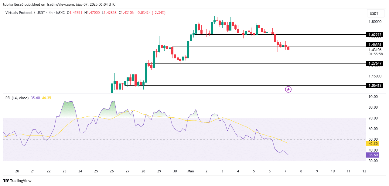 Nếu áp lực này tiếp tục, VIRTUAL có thể giảm xuống 1,27 USD, với mức hỗ trợ tiềm năng tiếp theo tại 1,064 USD.