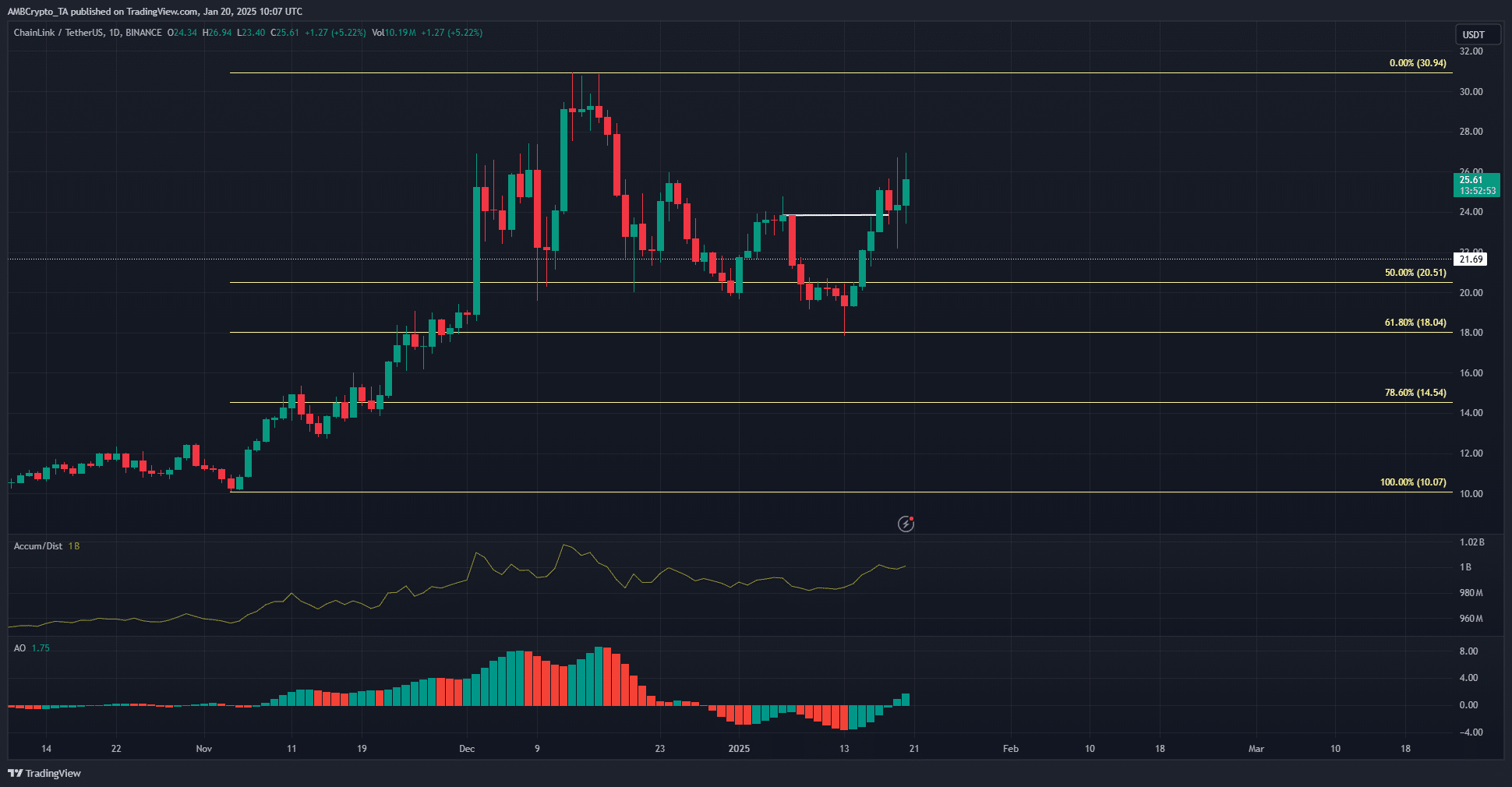 Mức Fibonacci 61,8% đã được kiểm tra lại và vùng tâm lý 20 USD không bị từ bỏ dù tâm lý thị trường gần đây có xu hướng giảm. Khả năng phục hồi có thể chuyển thành xu hướng tăng và có khả năng đẩy Chainlink vượt qua 31 USD.