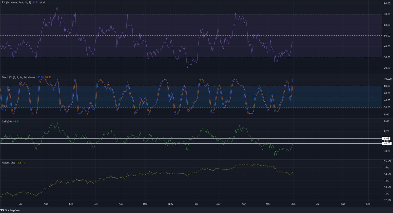 CMF đã nằm dưới -0.05 kể từ tháng 4, nhưng vào thời điểm báo chí đang trên đà tăng trở lại trên nó cho thấy áp lực bán đã giảm xuống. Vào tháng 5 năm 2022, A / D đã có một bước nhảy vọt, nhưng nó đã tăng lên về tổng thể kể từ tháng 8 năm 2021.