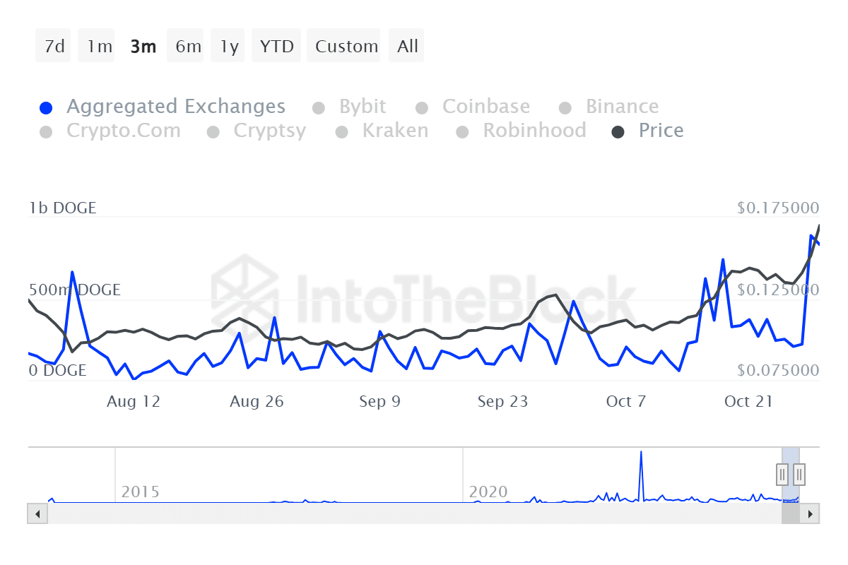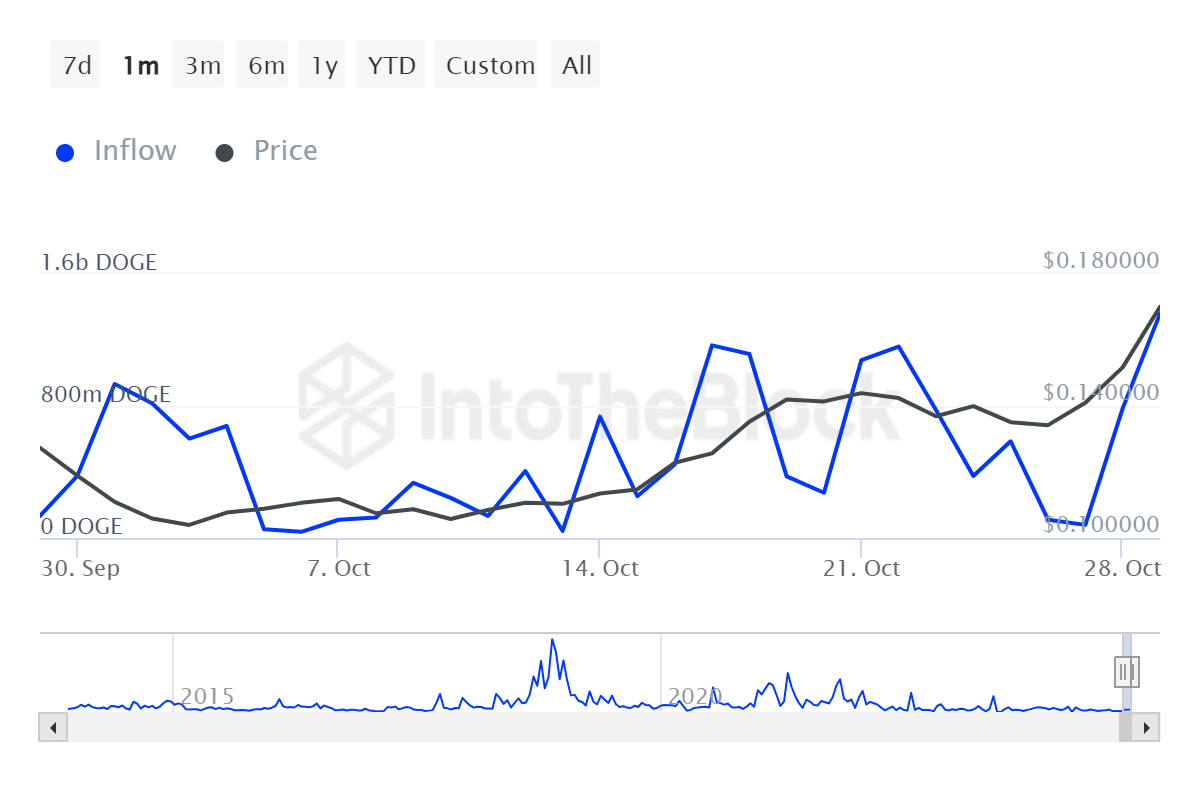 Dữ liệu Chain cho thấy đợt tăng giá gần đây của Dogecoin được hỗ trợ bởi nhu cầu mạnh mẽ từ các cá voi. Ví dụ, lượng vào các tài khoản lớn đã tăng nhanh từ 79,55 triệu DOGE lên 1,36 tỷ DOGE, tính đến ngày 29 tháng 10.