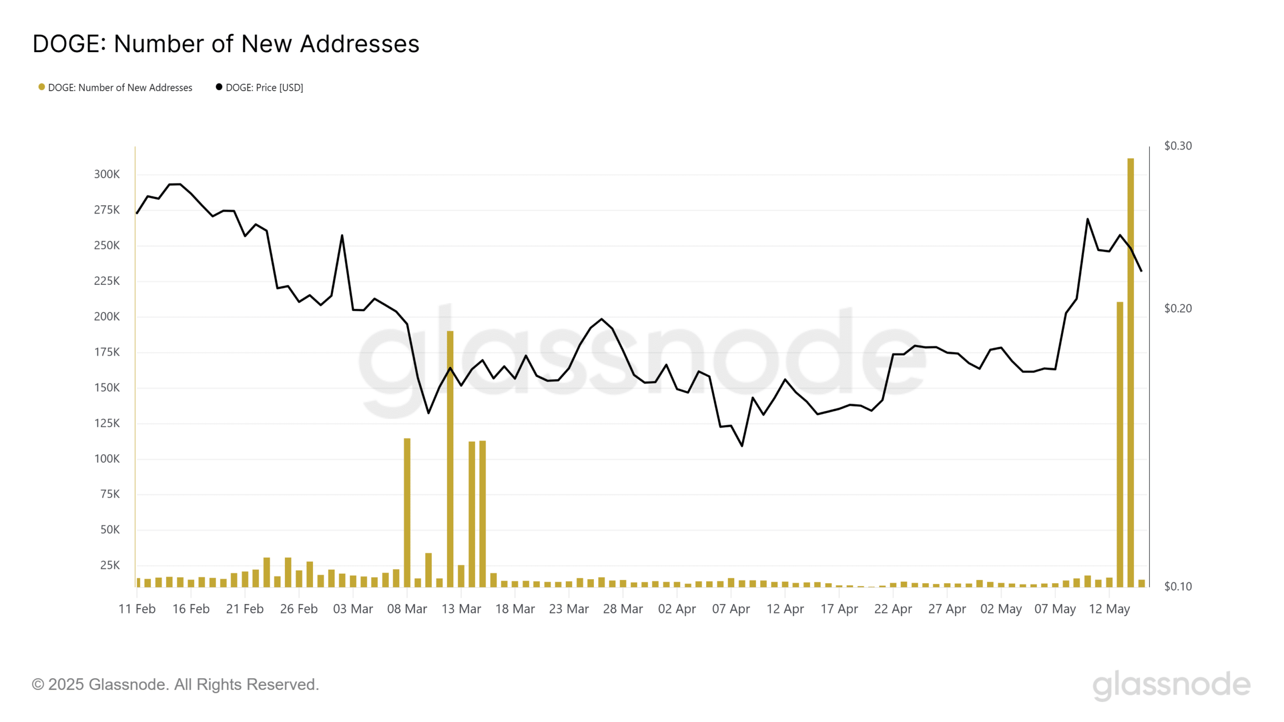 Vào ngày 14 tháng 5, số lượng địa chỉ mới của DOGE đã tăng lên 311.811, mức cao nhất trong sáu tháng, báo hiệu sự quan tâm quay lại từ thị trường bán lẻ trong bối cảnh biến động.