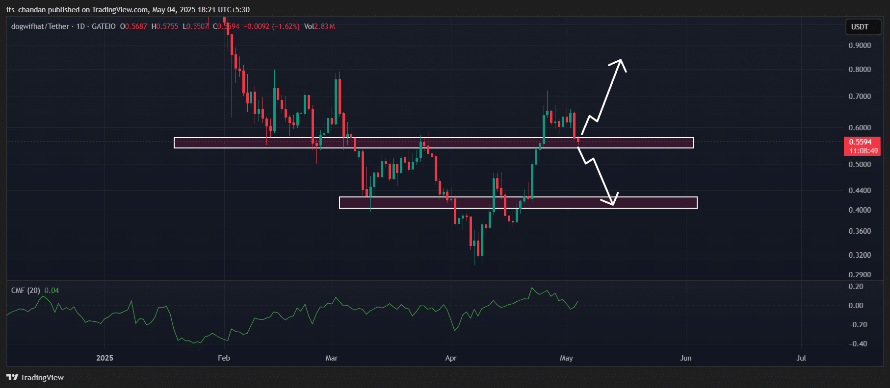 Theo phân tích của TinTucBitcoin, WIF đang ở mức quyết định. Biểu đồ hàng ngày cho thấy nếu tâm lý thị trường không thay đổi và memecoin không giữ được mức hỗ trợ 0,545 USD, nó có thể chuyển trở lại xu hướng giảm.