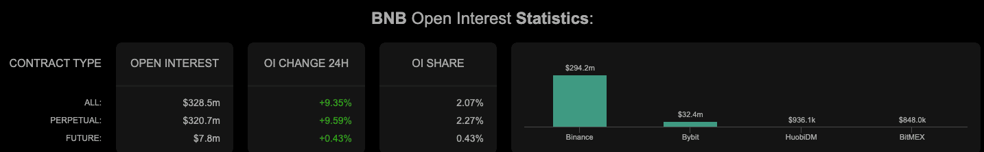 Đó là khoảng 328 triệu đô la trên tất cả các sàn giao dịch. Điều này ngụ ý rằng có rất nhiều hợp đồng được mở để kiếm lợi nhuận từ BNB.