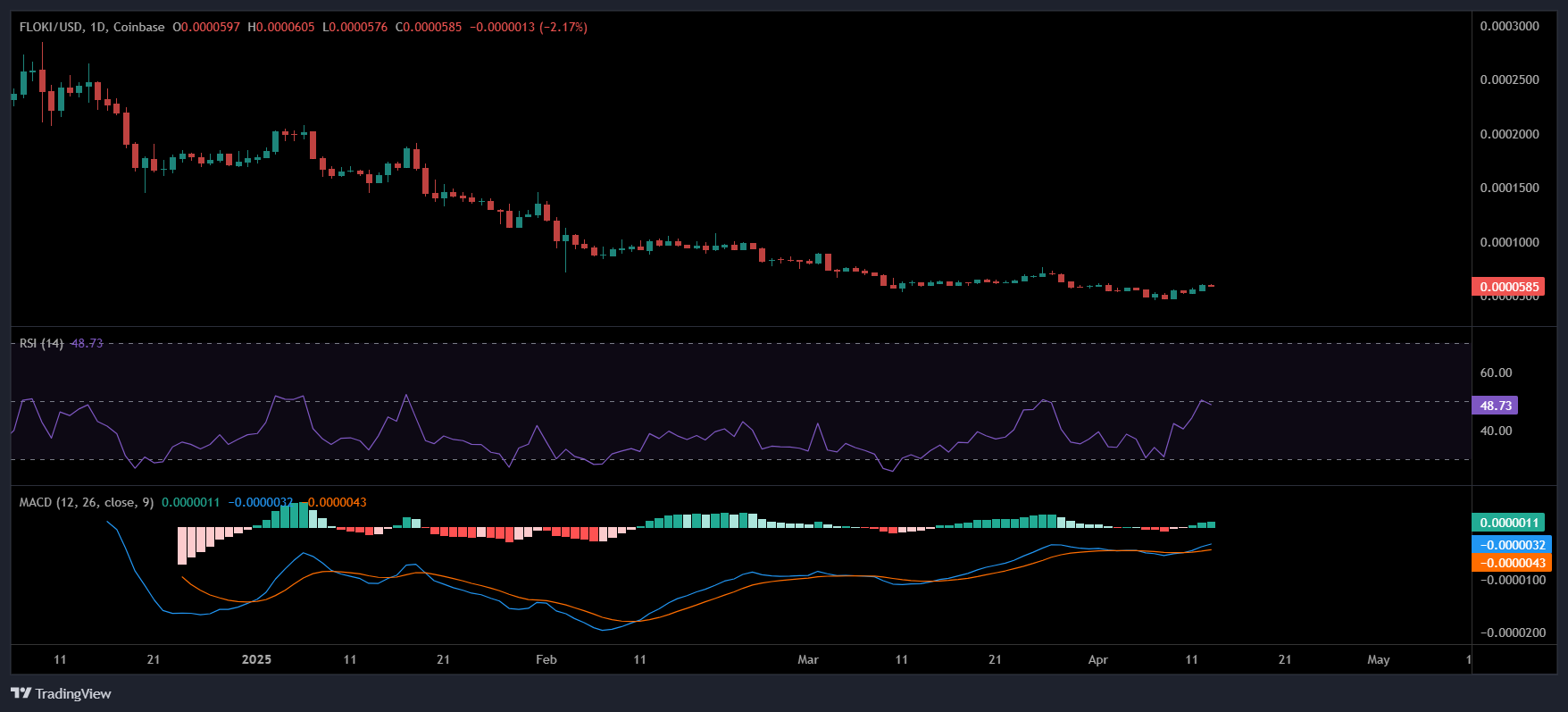 Sau hai tháng, FLOKI vẫn duy trì trong khoảng giá từ 0,000047 USD đến 0,00008 USD. Ngày 6 tháng 4, giá giảm 11,82% trong ngày đã kéo RSI vào vùng bán quá mức, báo hiệu khả năng suy yếu của phía bán.