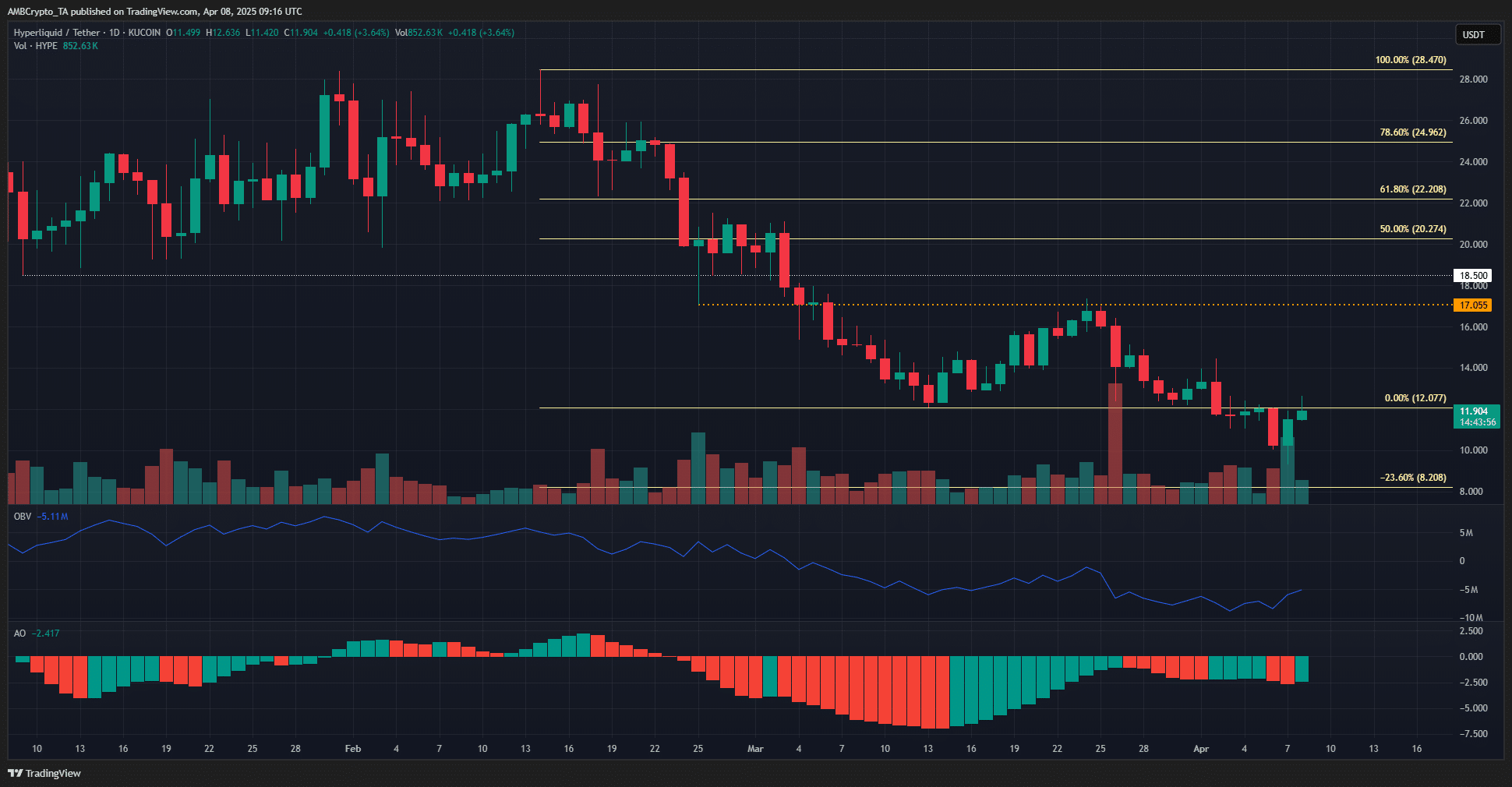 HYPE giảm xuống dưới 12 USD để kiểm tra mức 10 USD, củng cố xu hướng giảm. Xu hướng này đã rõ ràng kể từ tháng 2, khi chỉ báo OBV cho thấy sự giảm dần do áp lực bán liên tục.