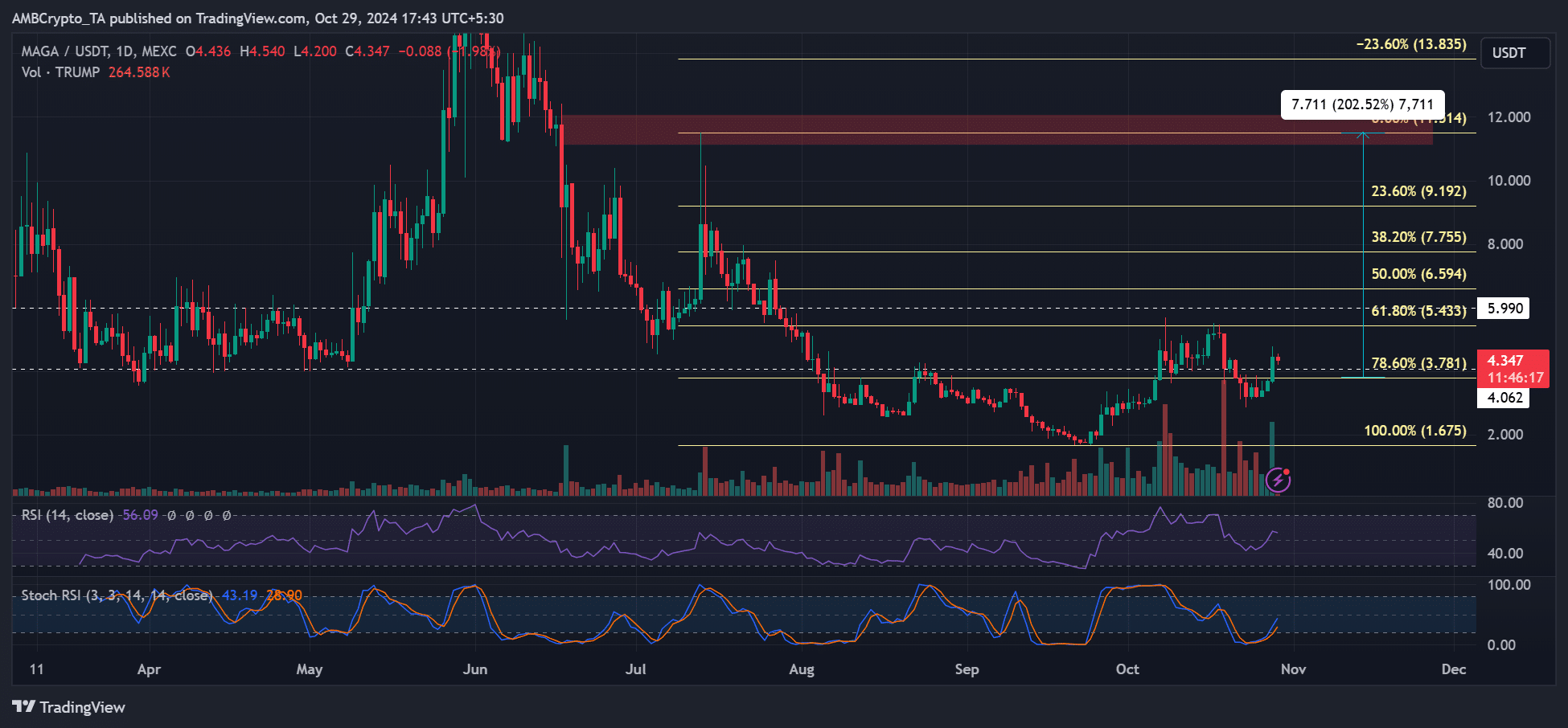Mặc dù Bitcoin [BTC] là một trong những ‘Trump trade’ được theo dõi sát sao do khả năng thắng cử ngày càng gia tăng của cựu tổng thống, các đồng tiền khác như MAGA crypto cũng đã hưởng lợi.