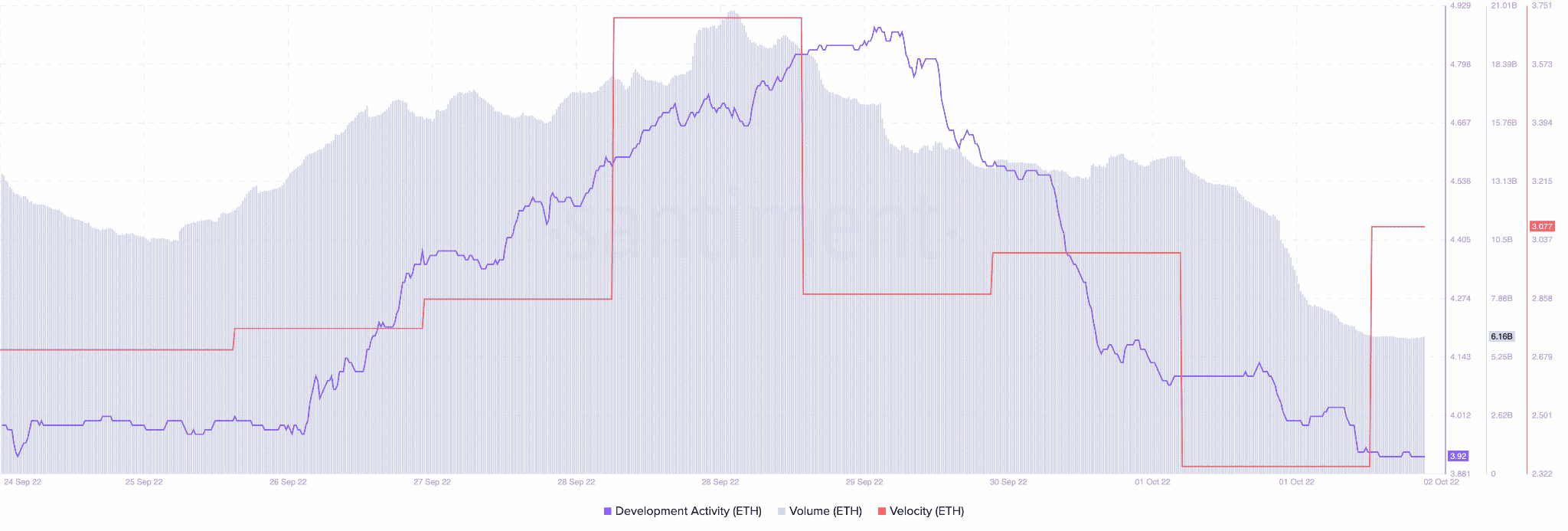 Hãy xem xét điều này – khối lượng của Ethereum đã giảm trong vài ngày qua, như có thể thấy từ biểu đồ đính kèm ở đây. Nó đã giảm từ 13,12 tỷ vào ngày 30 tháng 9, xuống còn 6,03 tỷ vào ngày 2 tháng 10. Hoạt động phát triển của Ethereum cũng đang giảm, cho thấy rằng không có nhiều hoạt động trên GitHub của Ethereum.
