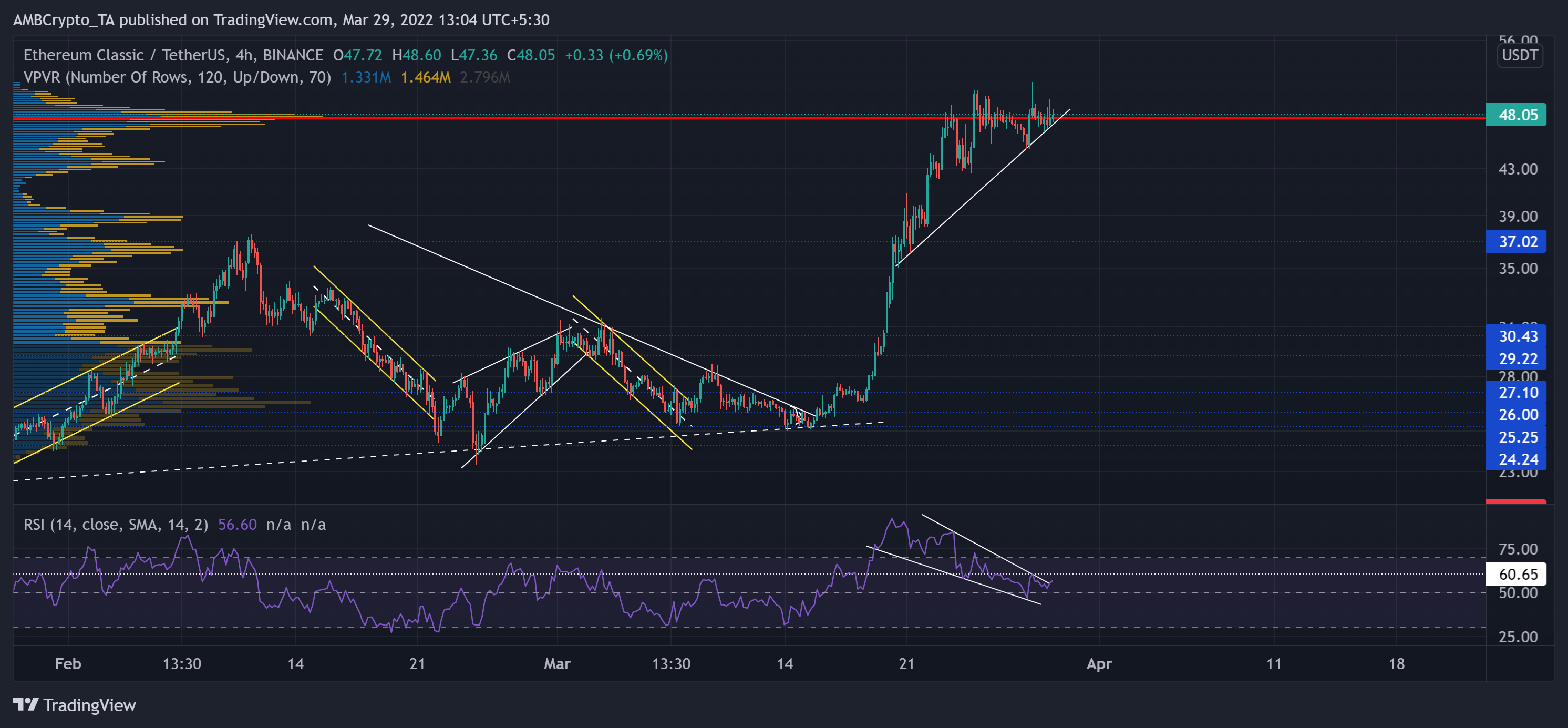 Kết quả là, nó đã chạm mức cao nhất trong 4 tháng vào ngày 29 tháng 3. Sau khi vượt qua mốc 37 đô la, ETC đã tăng lên Điểm kiểm soát (màu đỏ).