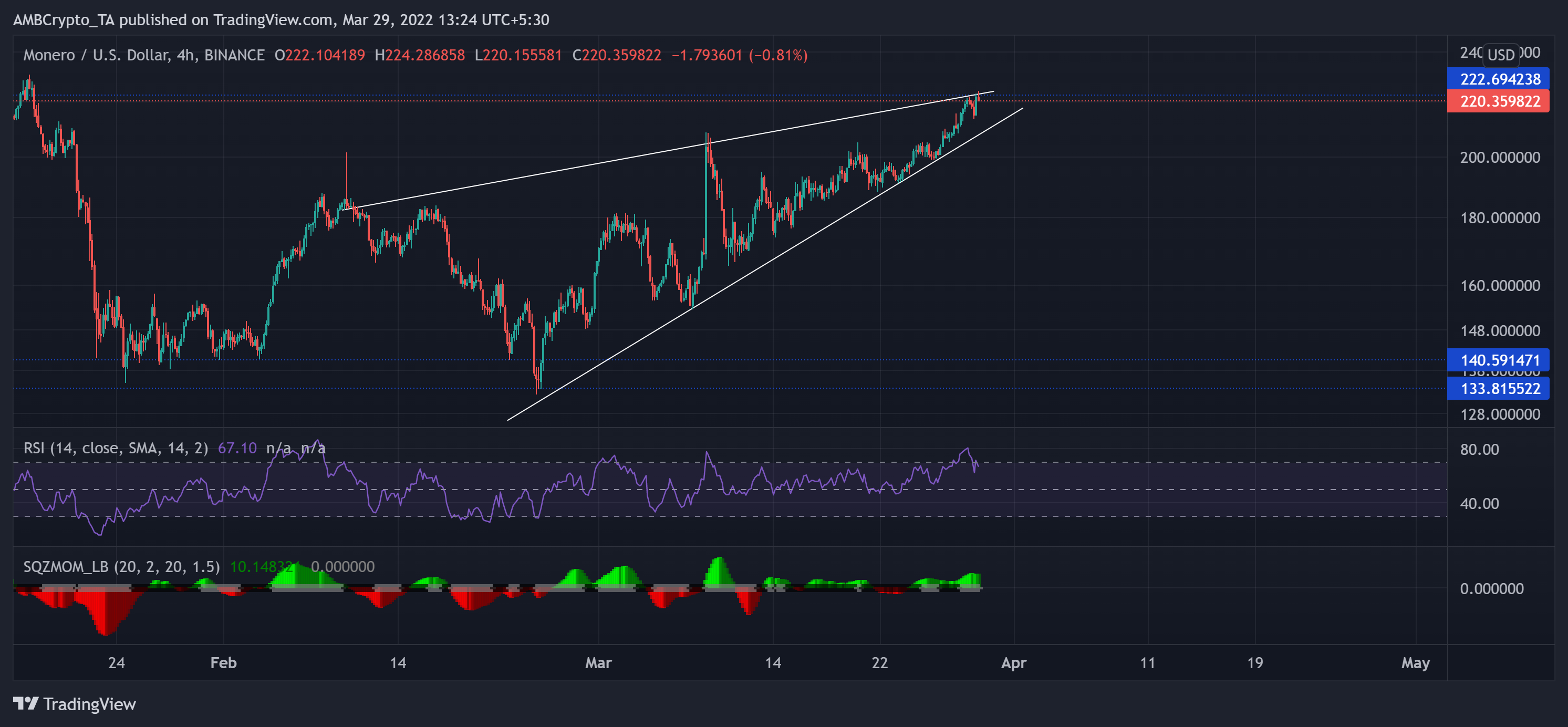 Kể từ khi chạm mức thấp nhất trong 13 tháng vào ngày 24 tháng 2, XMR đã phục hồi gần 70% theo hướng kháng cự dài hạn $ 222. Trong khi đó, nó chứng kiến một nêm tăng trên biểu đồ 4 giờ của nó.