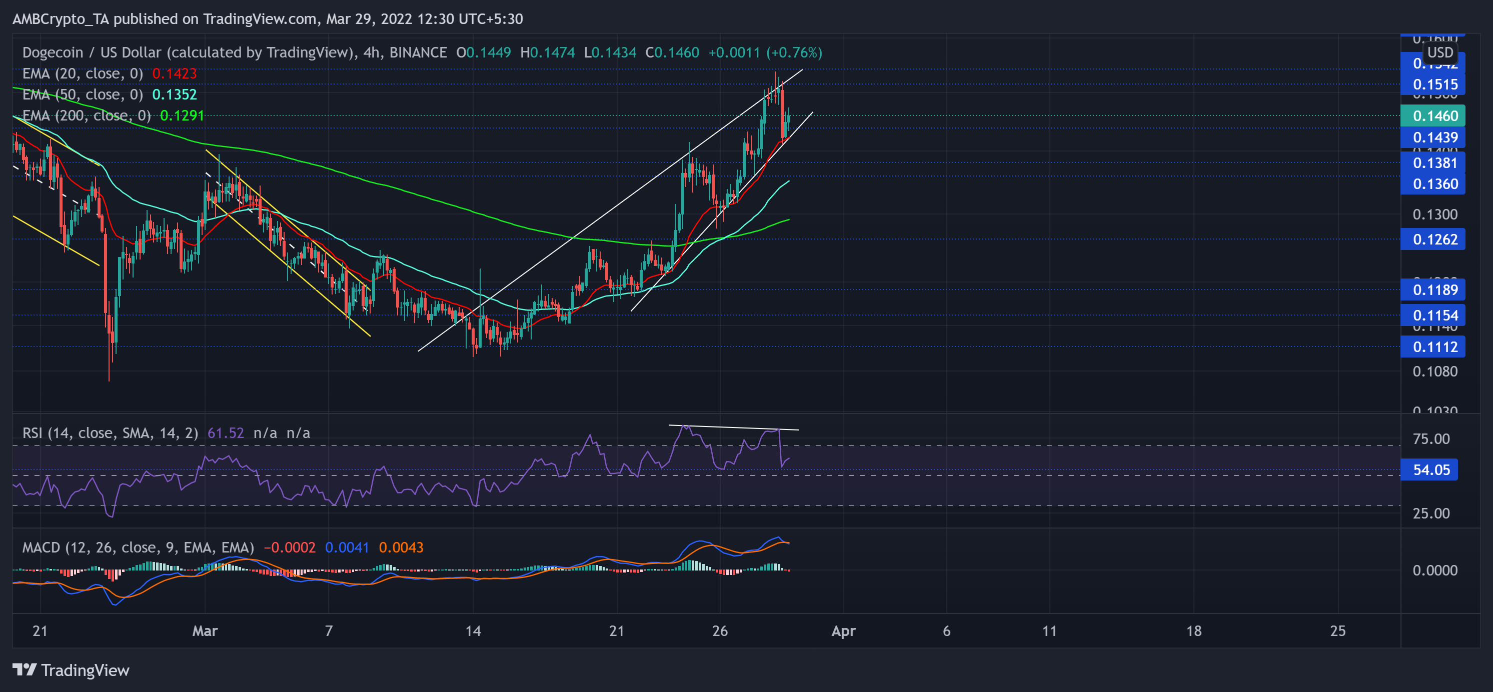 Cuộc biểu tình gần đây đã đẩy DOGE lên trên EMA 20/50/200 khi phe bò lật ngược tình thế có lợi cho họ. Bây giờ, ngưỡng kháng cự của đường xu hướng dài hạn tại mốc $ 0,15 đã đứng vững.