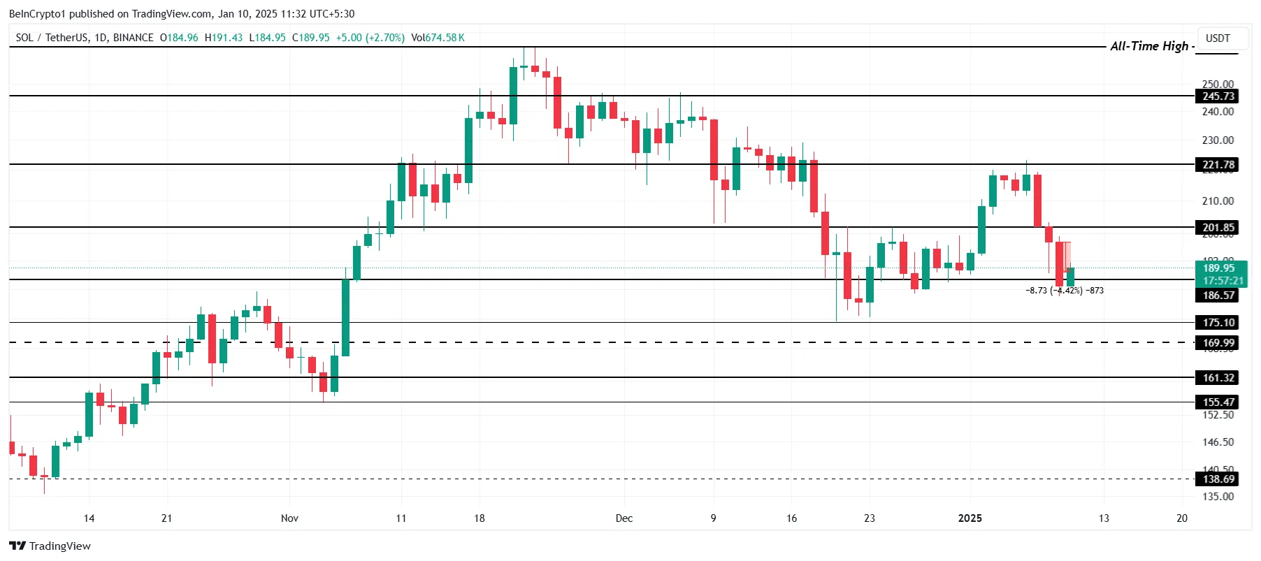 Hiện tại, giá Solana đứng ở mức 188 USD sau khi lấy lại mức hỗ trợ quan trọng ở 186 USD. Altcoin hiện đang nhắm đến mức kháng cự 201 USD với mục tiêu chuyển đổi thành hỗ trợ để thiết lập nền tảng cho một đợt phục hồi tiềm năng.