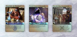 Điểm thu hút chính của dự án là một loạt thẻ giao dịch kỹ thuật số được tích hợp vào trò chơi khi ra mắt. Mỗi thẻ đều rất hiếm, với tác phẩm nghệ thuật theo chủ đề tưởng tượng dựa trên những khoảnh khắc và số liệu trong lịch sử blockchain sơ khai. Lá bài được thèm muốn nhất của trò chơi mô tả một Satoshi Nakamoto mặc áo choàng màu tím, theo phong cách ma túy đang chế tạo chuỗi khối của Bitcoin. Phiên bản của nó chỉ vỏn vẹn 200 thẻ.
