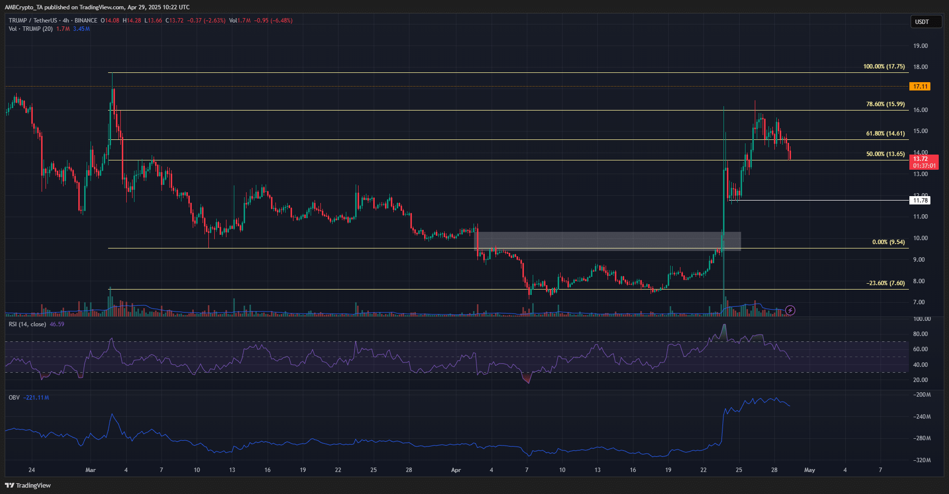 Hỗ trợ địa phương tại 11,78 USD (màu trắng) có thể được thử nghiệm lại nếu áp lực giảm ngắn hạn đẩy giá memecoin TRUMP xuống dưới mức thoái lui 50% tại 13,65 USD.