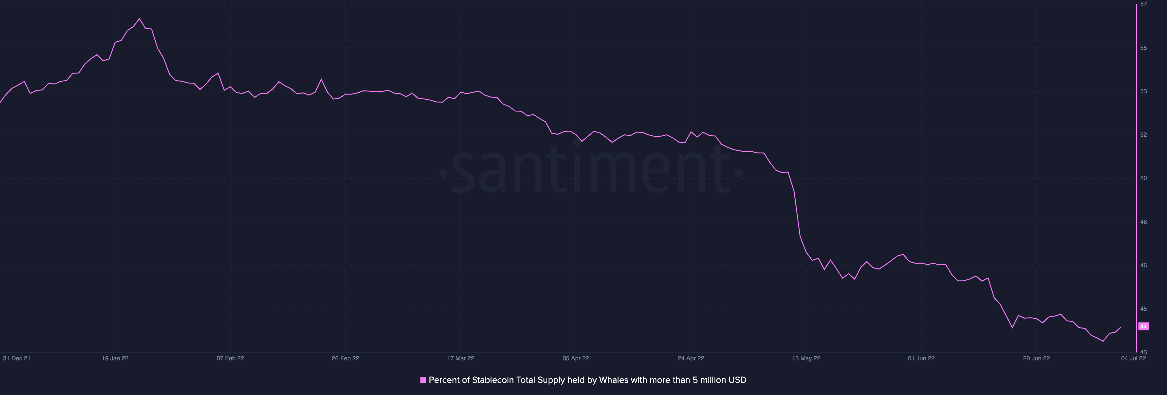 Theo dữ liệu từ Santiment, tổng nguồn cung tiền TRX do cá voi nắm giữ trong khoảng thời gian sáu tháng đã giảm dần. Đứng ở vị trí 44 vào cuối tháng 6, mức giảm 21% đã được ghi nhận trong khoảng thời gian này.