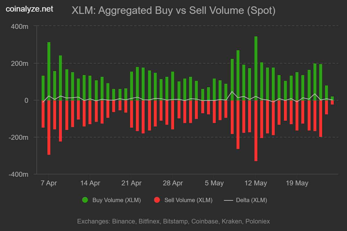 Thị trường giao ngay củng cố tông giọng giảm giá. Áp lực bán đang chiếm ưu thế, người bán XLM đã bán ra 21,95 triệu Token trong khi người mua chỉ mua 21,64 triệu, dẫn đến Delta âm 313,2K.